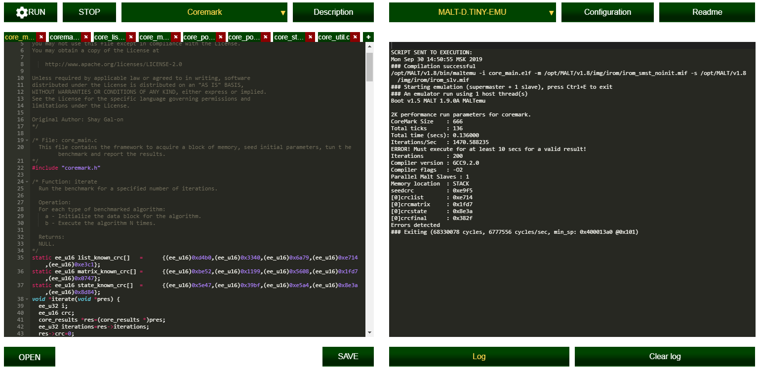 Выпущена первая версия онлайн-сервиса WEB_SDK, предоставляющий доступ к набору средств разработки MALT_SDK, который служит для проверки работоспособности программных кодов на существующих и проектируемых аппаратных платформах на базе процессоров MALT. MALT_SDK позволяет компилировать исходный код и выполнять его в виртуальной среде, где все реальные аппаратные компоненты процессора MALT и его окружение имитируются программным образом максимально точно до уровня потактовой совместимости, где это возможно.