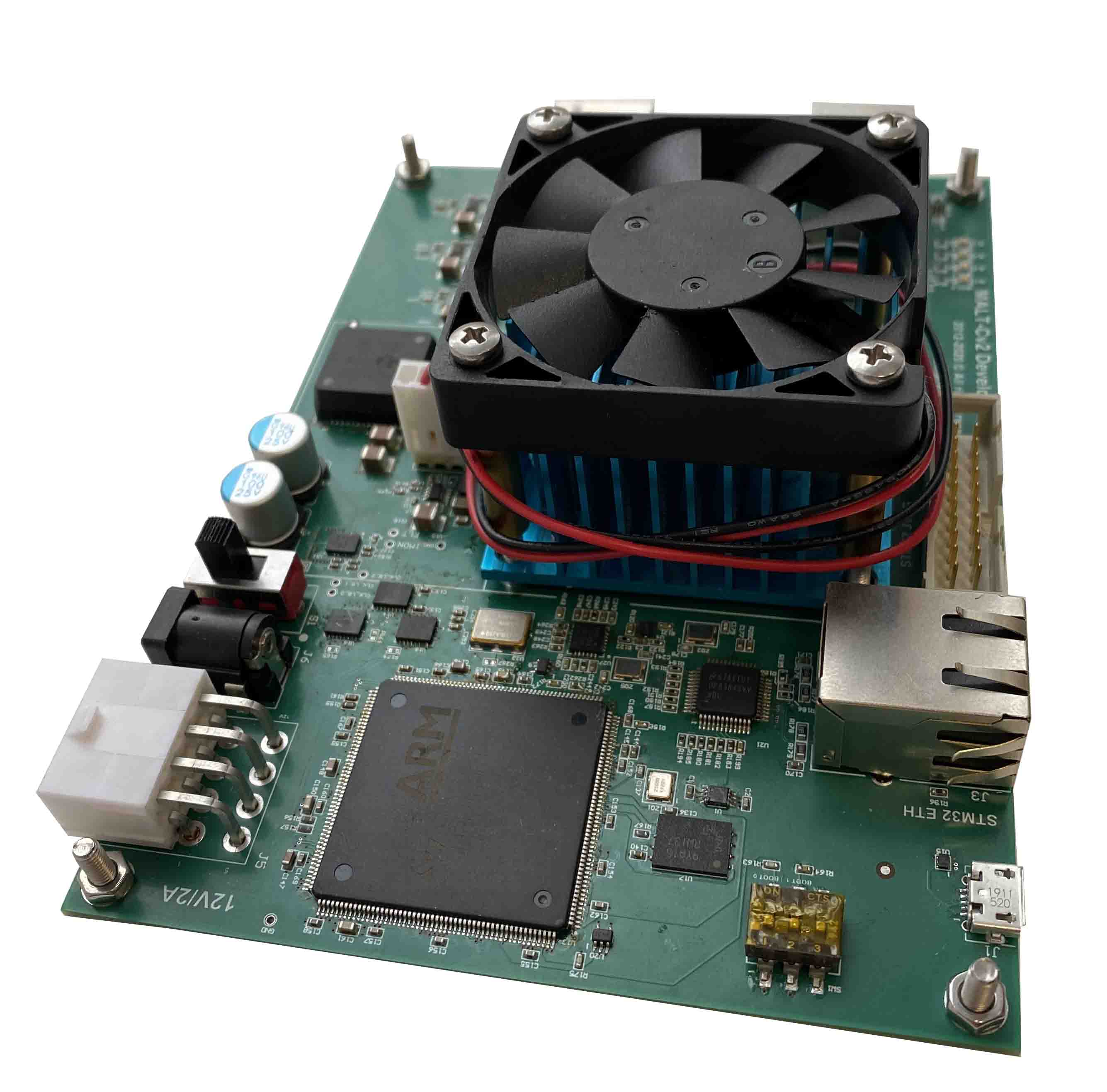 Размер платы составляет 100 х 140 мм, питание – 12В/2A. Для охлаждения микросхем на плате предусмотрен вентилятор.