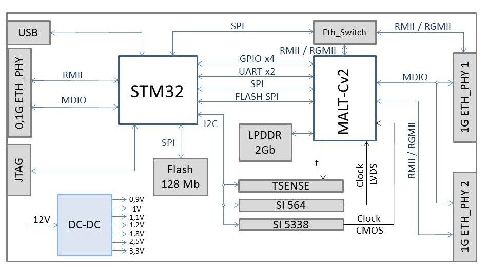 Системный контроллер отладочной платы, отвечающий за управление запуском и тактированием MALT-Cv2, интеграцию в многопроцессорные системы и другие сервисные функции, реализован на хорошо известном разработчикам ARM процессоре STM32. Для взаимодействия с другими устройствами на плате предусмотрено два 1 Гбит/с Ethernet интерфейса, подключенных к MALT-Cv2 и один 100 Мбит/с Ethernet интерфейс, обслуживающий системы контроллер платы. Также на плате размещен 5-ти портовый Ethernet-коммутатор, который позволяет отлаживать совместную работу по интерфейсу Ethernet нескольких устройств. Для подключения к программатору для отладки, тестирования и прошивки процессора на плате предусмотрены разъемы JTAG и micro USB. Для пользователей доступно 1ГБ LPDDR SDRAM и 128 Мб Flash памяти.