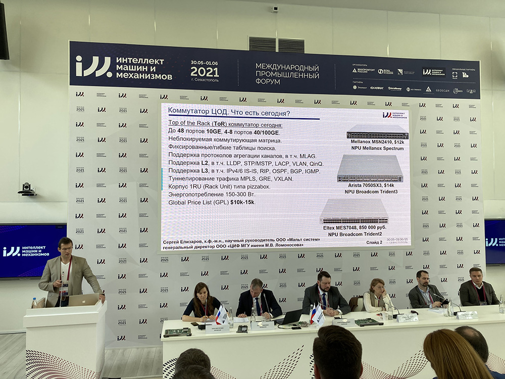 С 30 мая по 1 июня в г.Севастополь прошел первый в России международный промышленный форум “Интеллект машин и механизмов”. В форуме принял участие Сергей Елизаров, научный руководитель проекта MALT. В ходе секции “Телекоммуникационное оборудование” он представил доклад “Разработка отечественного коммутатора для ЦОД в рамках сквозного проекта”. Сергей рассказал о том, как развивается рынок коммутаторов для ЦОД сейчас, что потребуется через 5 лет, а также предложил план развития сквозного проекта по разработке отечественного коммутатора.